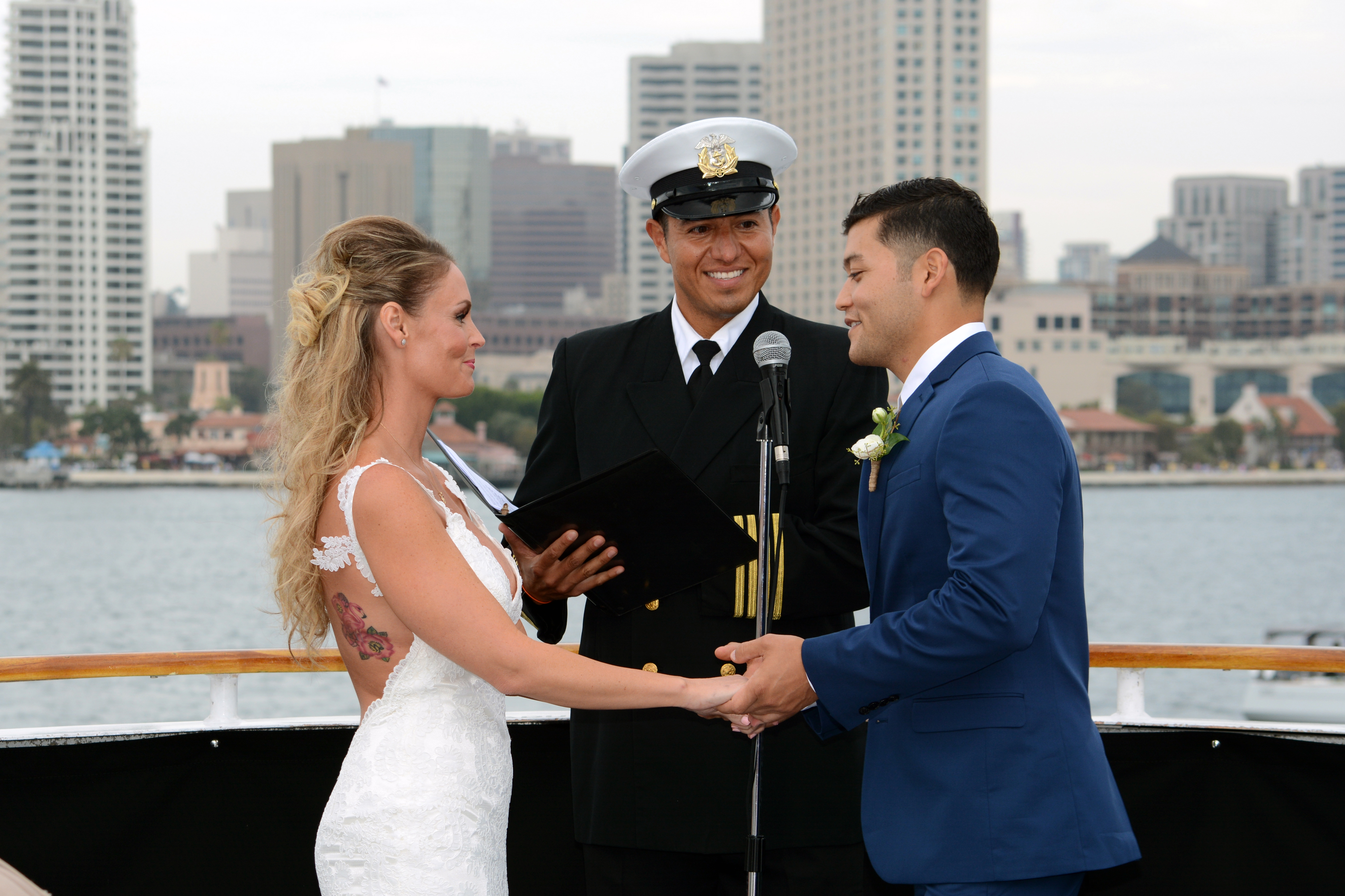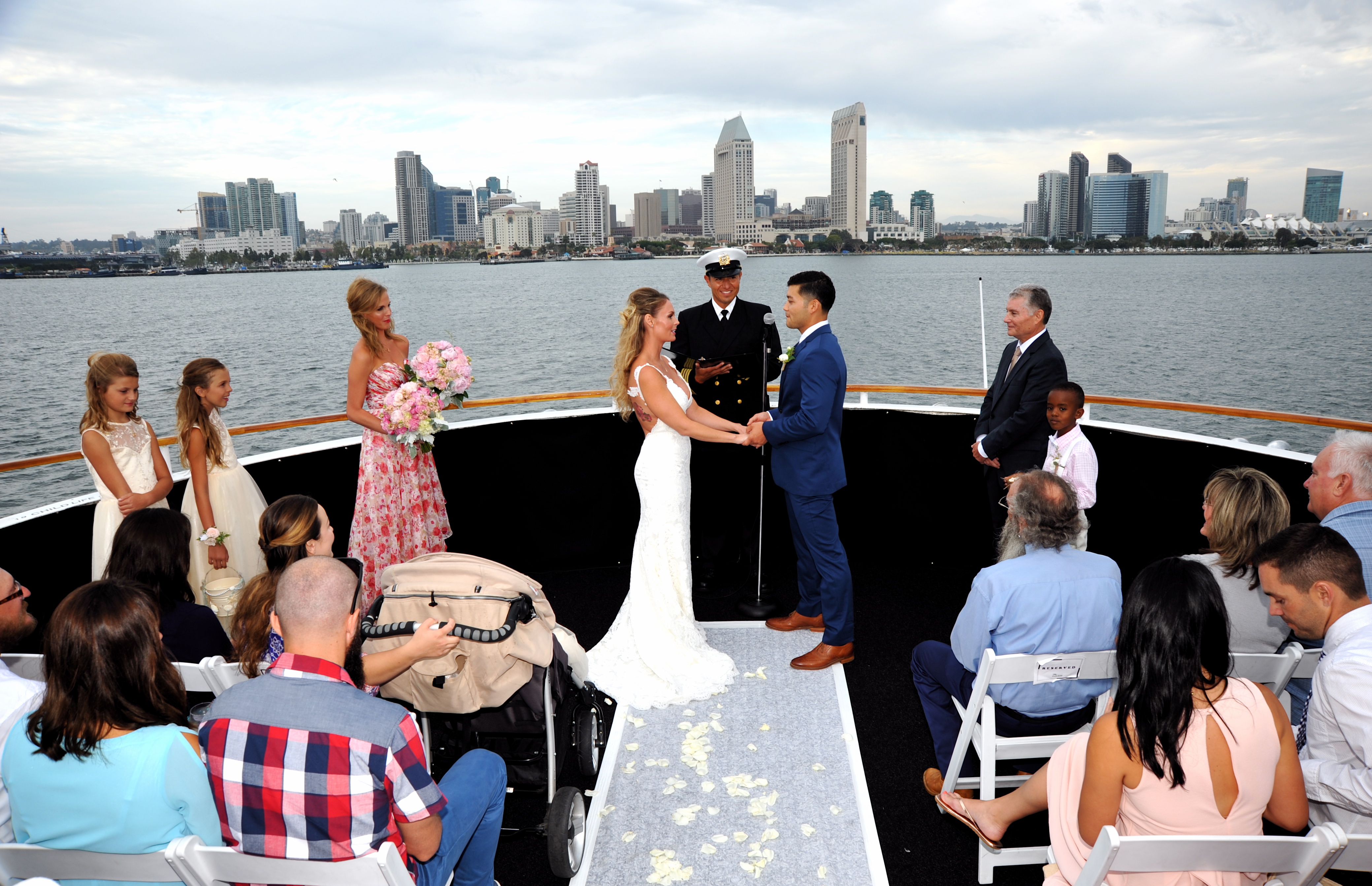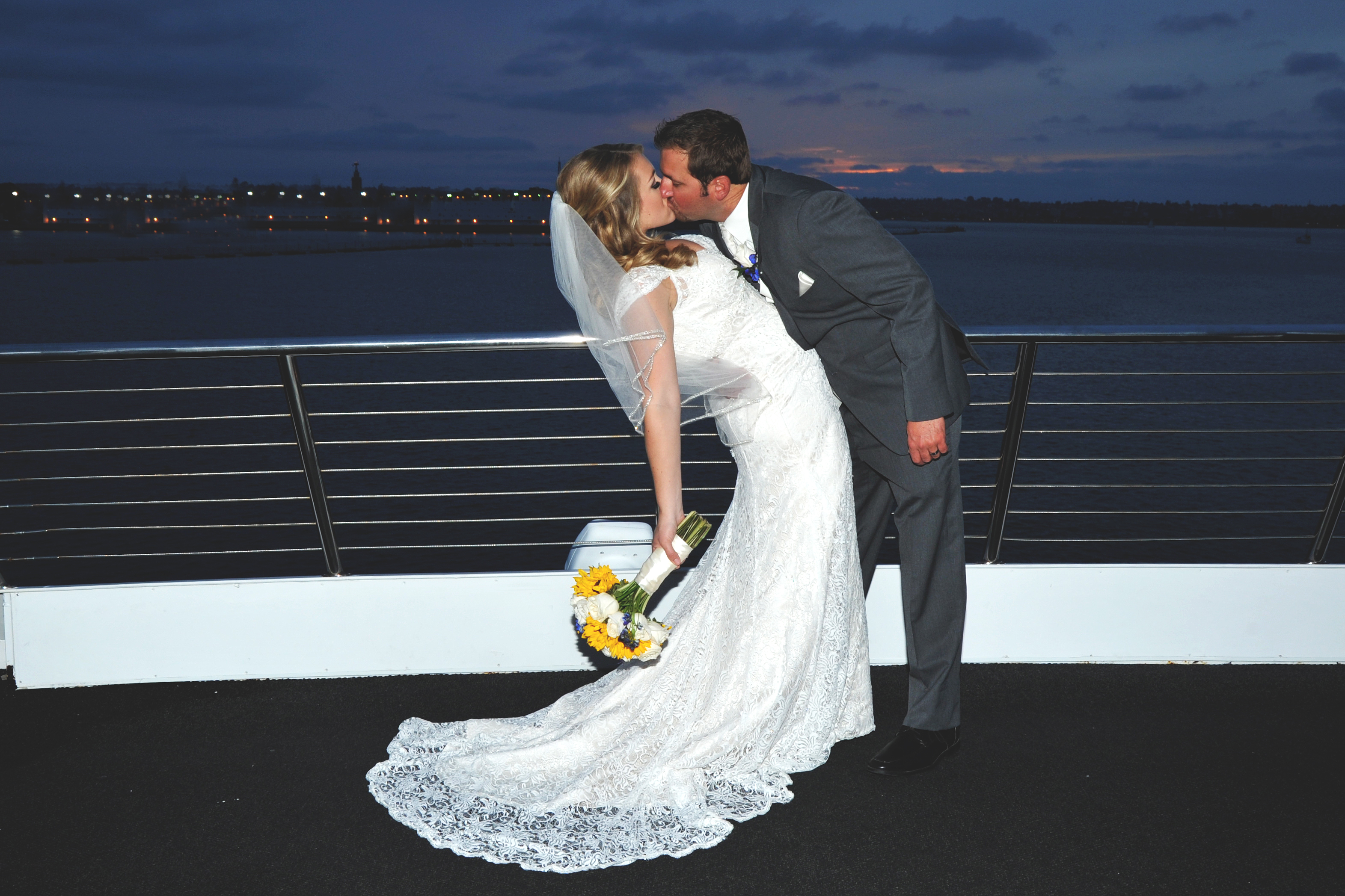 San Diego, California is the perfect location for a destination wedding! Where else can you have a December wedding on a yacht, and enjoy warm weather during winter? With gorgeous views and crystal blue waters, Americas finest city is the best choice for many couples planning their wedding day. Matt and Andra selected Flagship Cruises to host their wedding celebration aboard the yacht “Quiet Heart”. Their ceremony was attended by an intimate group of family and friends, who boarded for a 3 hour cruise on San Diego Bay. The Captain officiated, as the couple took their vows on the bow of the boat. The sun was setting during the wedding portraits, and they will forever remember that amazing golden backdrop as the scene for their wedding day.