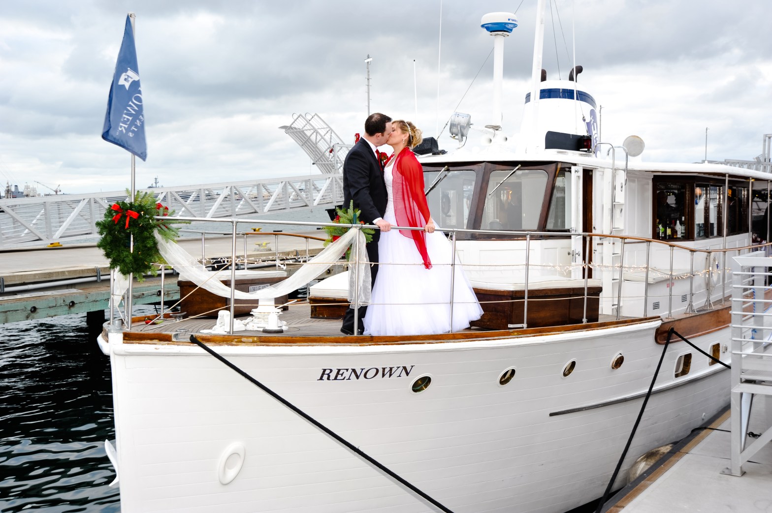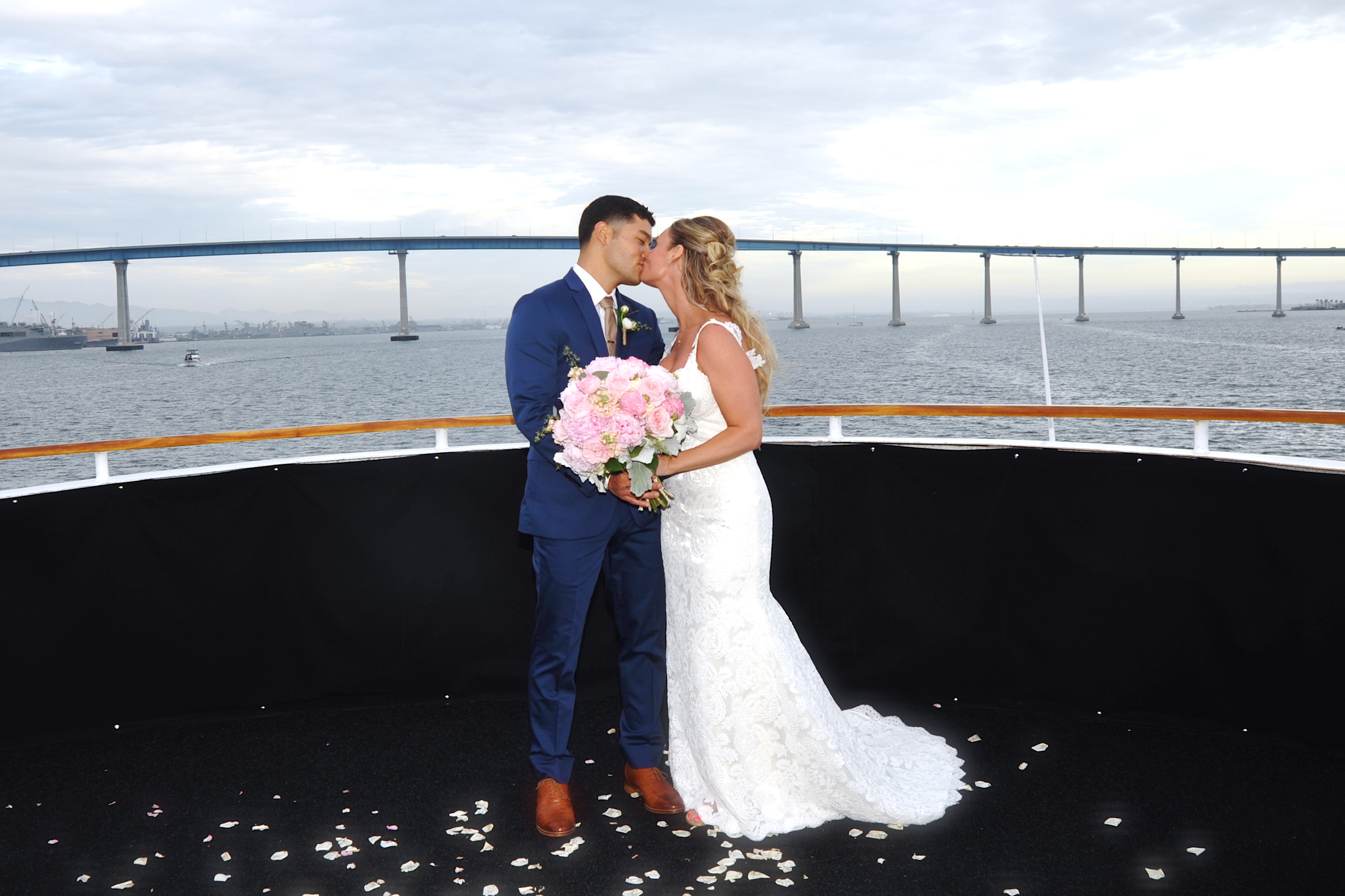 I love a Christmastime wedding with all the fragrant holiday flowers and decorations! Where else can you have a destination wedding on a yacht in December? San Diego Bay was the perfect choice for Jenna and Matt to hold their private wedding aboard the MV Renown. The weather was crisp, the air was so clean and the water sparkled as the Bride and Groom had their first kiss as husband and wife. Their guests dined on a gorgeous lunch while we sailed around San Diego Bay, and went under the Coronado Bridge. The meal was followed by a champagne toast, and cake cutting. What a fantastic way to wrap up 2015. Congrats to the lovely newlyweds!